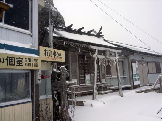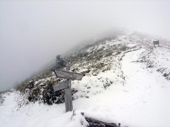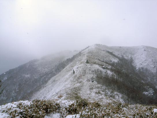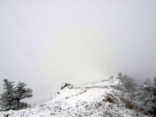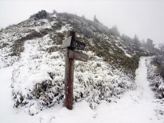 三嶺(みうね)までの縦走は諦めて山を下りることにした.天気予報では午後には雪は止みそうだというので、雪が小止みになるまで暫くヒュッテで時間を潰すことにした.この天気では誰も登山に来ないだろうと思っていたが、徳島の板野町から来たという50〜60歳位の男性2人連れがヒュッテにやってきた.見ノ越まで車で来て、そこから刀掛経由で登ってきたのだという.ヒュッテの常連の登山客のようで年に十数回は登っているという.暫くこの男性2人連れとヒュッテのおばあちゃんとで雑談をしていた.