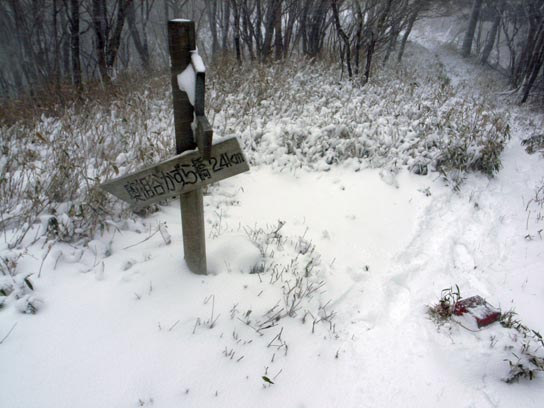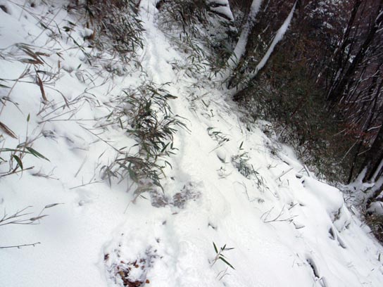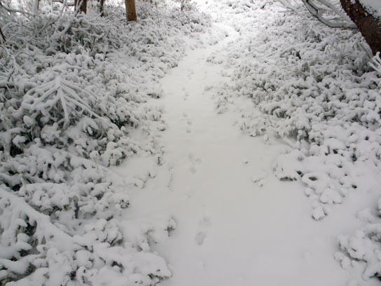 お昼過ぎ頂上ヒュッテを後にして丸石へ向かった.登山道は雪にすっぽり埋まっていて足下の様子が全く分からない.一歩づつ恐る恐る着地しながら足下の様子を探っていく.落ち葉の上に積もった雪は落ち葉ごとズルッと滑るし、石や木の根は雪に隠れて見えないので、いつもの半分のスピードしか出せない.山を下りるまで予想以上に時間を取られそうだ.このままでは予定していたバスには乗れそうもなかった.