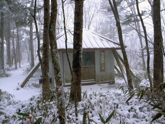 尾根ルートは誰も歩いた形跡が無く、登山道には鹿や小動物の足跡しか残されていなかった.登山道を見失うことは殆ど無かったが、雪の中の笹漕ぎは足下の様子が全く分からず結構大変だった.結局、剣山から2時間近くも掛かってようやく丸石避難小屋に着いた.一の森の避難小屋と違ってこちらの避難小屋は板敷きの床が貼られているだけのシンプルな小屋だった.