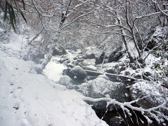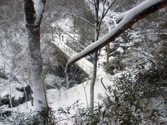 ここからは九十九折りの急な斜面を下りて行くことになる.慎重に一歩一歩足を進めて行くが、足を滑らせ何度も斜面を滑り落ちそうになった.やっとのことで国体橋という沢に掛かっている橋の所まで下りてくることができた.ここからは沢沿いに下りていくようだが、雪で登山道がどこなのか見分けが付かない.途中何度か道を見失いながらも足場の悪い沢沿いの道をかずら橋まで辿り着くことができた.