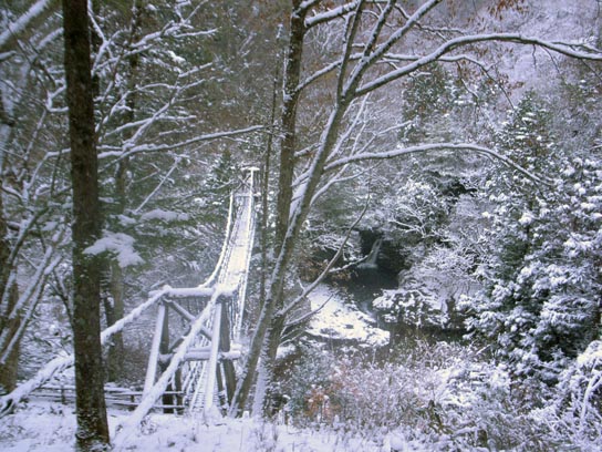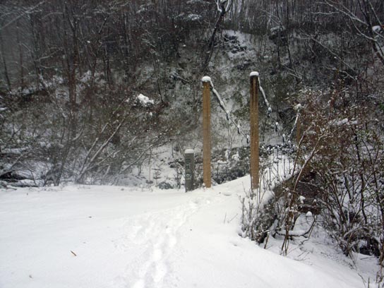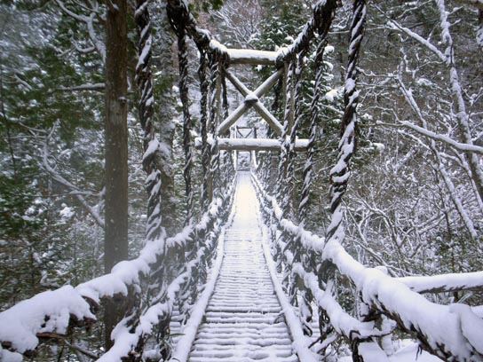 奥祖谷二重かずら橋は男橋と女橋の2つの橋が並んで架かっているので二重かずら橋と呼ばれているという.単に私が見逃しただけかもしれないが、私がこの橋を渡った時には橋は一つしか見あたらなかった.橋は誰も渡った形跡がない.この雪の中にわざわざこんな奥地まで見物に来る観光客も居ないのだろう.本当なら 500円の通行料を取られるのだが、徴収窓口には誰もおらず、近くにも人が居る形跡はなかったので、仕方がないのでそのまま素通りさせて貰った.