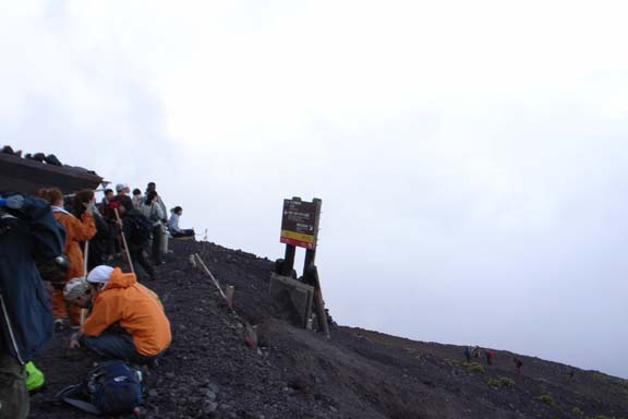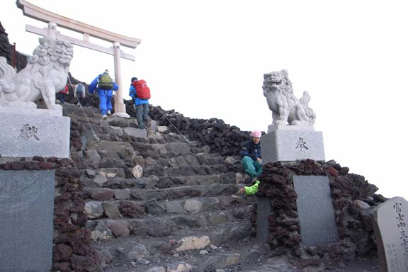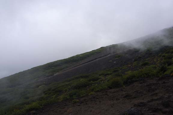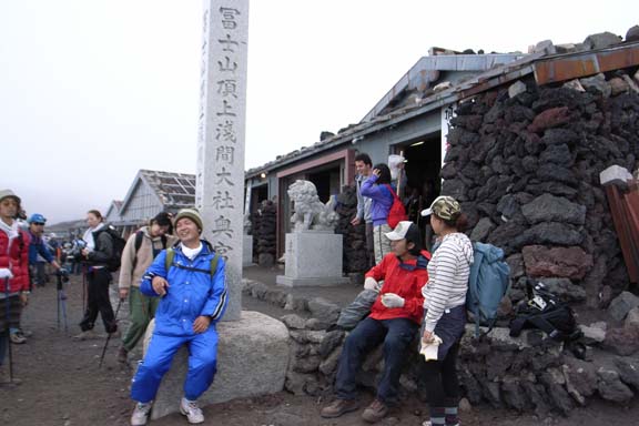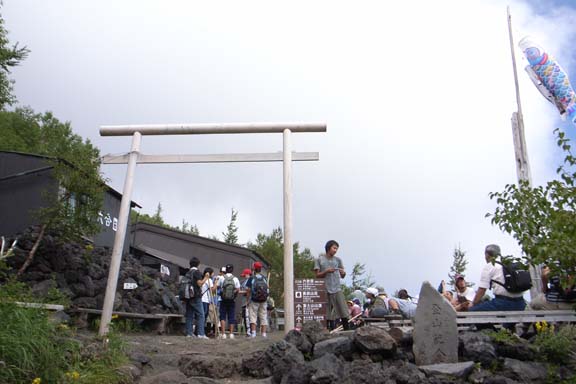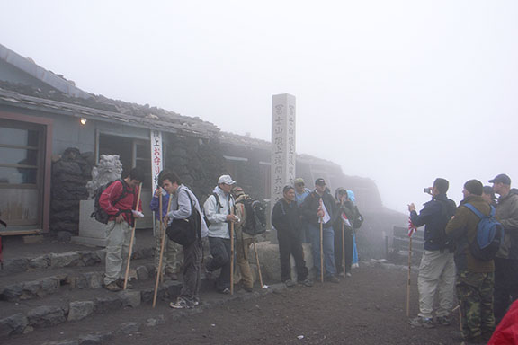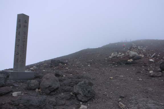 予定よりも大幅に遅れて須走口頂上に着いたが相変わらずガスって居て周囲は何も見えなかった.普通の登山だと頂上に辿り着いたときにはそれなりの感動があるのだが、今回は淡々としたものだった.頂上付近では皆浅間神社の奥宮の石柱の前で皆記念写真を撮影している.時間があればお鉢巡りをするつもりだったが、視界も悪く帰りのバスの便のことも考えて、お鉢巡りは次回の御来光登山のときに行うことにして、30分ほど休憩した後直ぐに須走口の下山道を下りることにした.