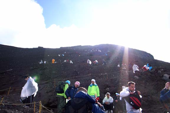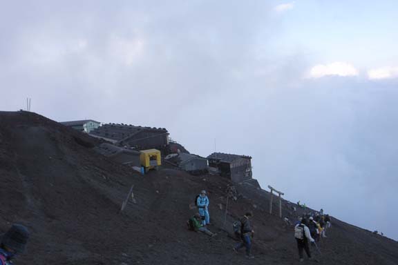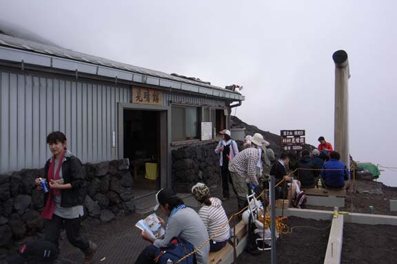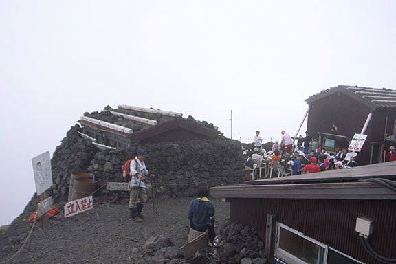 8合目を過ぎた辺りで雨が降りだし、そこから先はかなりガスって居て視界が悪かった.8合目からは吉田口からの登山道と合流するため、登山道は更に人で溢れかえっていた.シーズン中の御来光登山の時間帯には、8合目から頂上までは渋滞で一歩も進めなくなるという.今回は週末の土曜日とは言え、昼間の時間帯なのでまだ空いているのだろう.