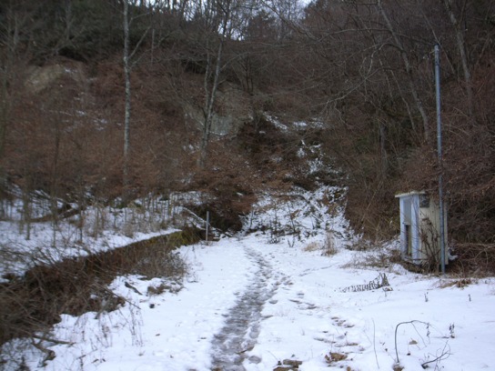国道とは言え歩道すらない道志みちを歩くのは気が進まなかったが、自然歩道をピストン往復することはしたくはなかった.平野から40分ほどで山伏峠に着いた.前回は暗闇の中で峠から道志みちへ降りる登山道を見つけられずに峠の南側斜面の私有地を突っ切って道志みちへ出た.山伏トンネルをくぐり抜け峠の北側斜面の登山道入り口を探した.登山道入り口はトンネルに向かって左側にあった.溶け残った雪がかちかちに凍っていてとても滑り易かった.登り始めて直ぐに峠の鞍部に出たが、標識が殆どなく道跡もあまりはっきりとしていないので、真っ暗な中をヘッドランプの明かりだけで歩いたのでは到底降り口を見つけられないだろう.トンネルの入り口から15分程で大棚ノ頭へ到着した.