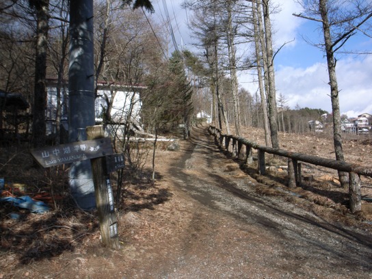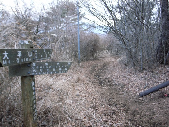 頂上のベンチでおにぎりを食べながらこれから向かう平尾山、大平山の確認をする.山中湖を見下ろすには絶好のロケーションだ.辺り一面萱が生い茂る緩やかな斜面を降りて行き、別荘地帯を通り過ぎるとやがて元の道志みちに戻ってきた.先程通り過ぎた小さな神社(神社なのに不動明王???)の祠の前を今度は左側に入って行く.百メートルほど舗装道路を行った所で左折して平尾山へ向かう登山道が続いていた.