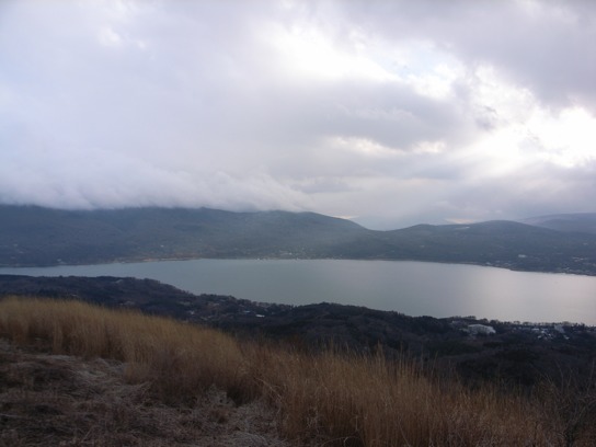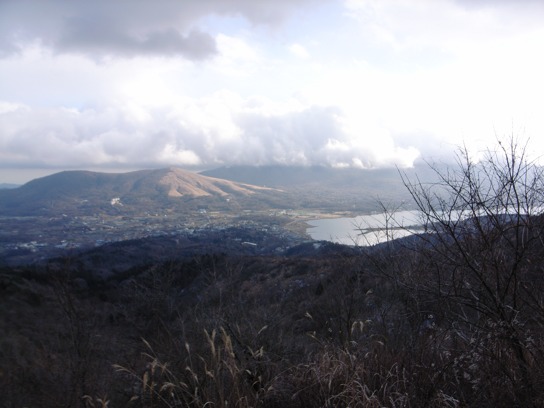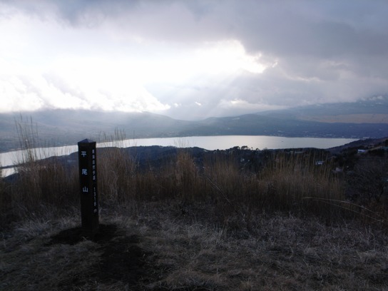 既に午後2時30分を過ぎており、2〜3組のハイカーとすれ違っただけで殆ど人と会うことはなかった.平尾山の頂上に着く頃には日射しは殆どなくなり時折雪がちらついていた.山中湖を眼下に眺めながら尾根沿いの緩やかな道を大平山へ向かう.TVの送信所があるあたりが大平山の頂上なのだろう.緩やかな斜面は木が殆どなくパラグライダーの練習に向いていそうだった.大平山の頂上からの眺めも素晴らしく山中湖や富士山が一望できるのだが、やはり富士山は雲の中だった.どうも富士山とは相性が悪いようだ.今度完全に晴れ上がったときにでももう一度来てみようと思う.