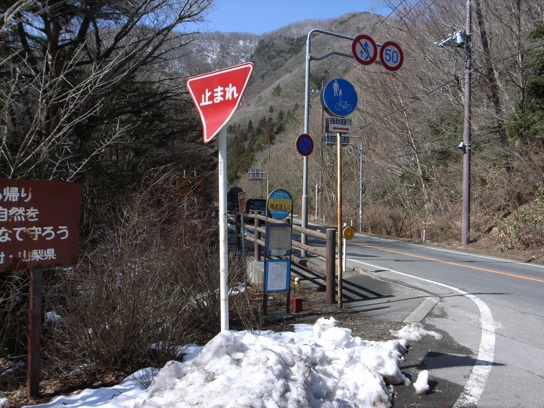 3月中旬になってやっと天気に恵まれ、久しぶりに東海自然歩道の本コースを歩くことにした.前回の離脱ポイントの精進湖入り口までは新宿からの高速バスと河口湖から富士宮へ向かう路線バスを乗り継ぎ、午前10時過ぎに精進湖入り口バス停に着いた.JR東海道線、身延線で富士宮へ出てから河口湖行きのバスに乗り継ぐ方が30分ぐらい現地に早く到着できるのだが、丁度青春18切符シーズン中ということもあり、座れそうもない東京発静岡行き(378M)の電車は極力避けたかった.この電車は東京方面から中部、関西方面へ行く中高年のための18切符専用列車となっており、乗り継ぎの静岡駅、浜松駅ではおじさんやおばさん達がホームを駆け抜けていくという摩訶不思議な光景を目にすることができる.