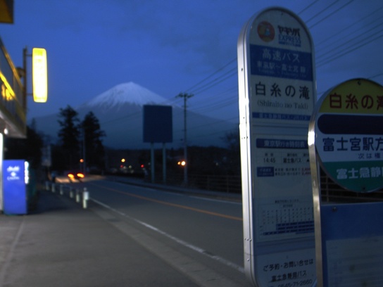 当初の予定では田貫湖畔の休暇村富士から 16:55発富士宮行きのバスに乗り帰宅する予定だったが、想定外の雪道でいつもより時間が掛かってしまい、田貫湖に着いたのは17:00だった.後10分ぐらい早く到着していたら何とか16:55発の最終バスに間に合ったのだが、残念ながらこのバスを逃してしまった.仕方がないのでそのまま白糸の滝まであと6〜7kmを歩くことにした.白糸の滝で18:20分発の最終の富士宮駅行きバスに乗りようやく富士宮駅に到着した.