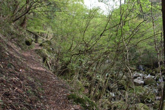 鯨野地区から山を越えて徳間へ向かうルートは、国土地理院の1/25,000 地形図では尾根の林道をそのまま横切って真っ直ぐに急な斜面を徳間地区へ下りて行く最短ルートなのだが、実際の東海自然歩道のルートは尾根の林道をそのまま下って行く大きく迂回するルートに変更されていた.結果としてこの区間で予定の2倍以上の距離を歩かざる負えなくなり、予定よりも1時間以上遅くなってしまった.