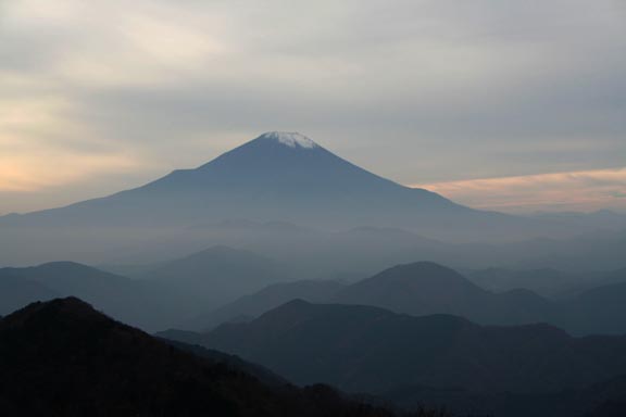 天気はイマイチ 二股 明るい尾根道 柔らかな土の道 鍋割山稜の尾根 富士山 眼下には美しい山々 表尾根と大山 落葉の鍋割山稜 丹沢主脈の稜線 鍋割山荘 墨絵のような富士山 少しづつ色鮮やかに 水ボトル置き場