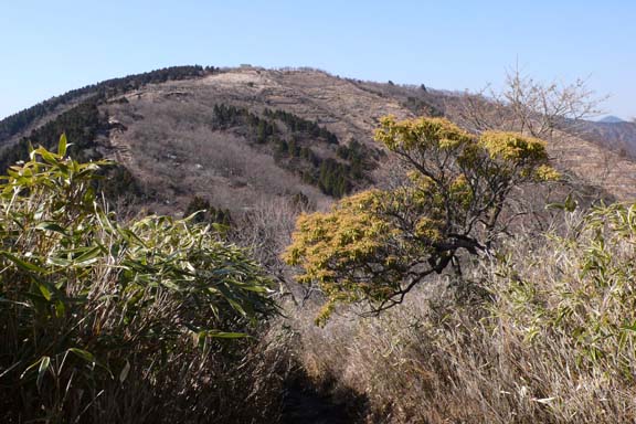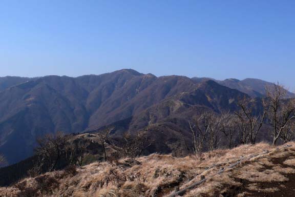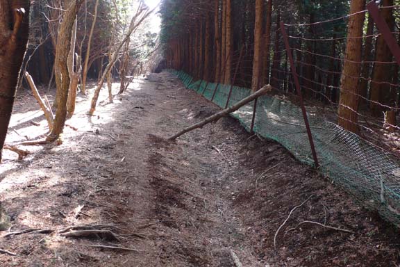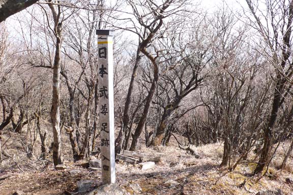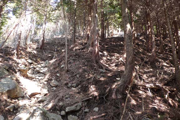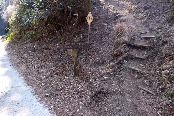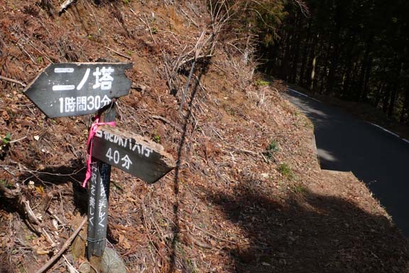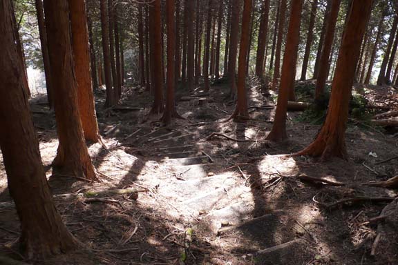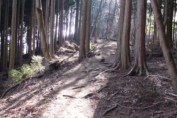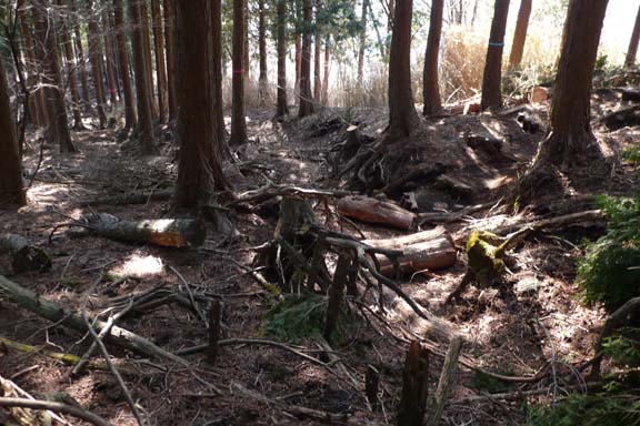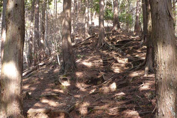 予想していたとおり二ノ塔尾根コースでは誰とも会わず静かな山歩きを楽しめたが、殆ど尾根沿いの杉林の中を延々と登る見通しの利かない退屈なコースだった.道も全く整備されておらず、どこがコースなのか殆ど分からないので、自分で適当に判断して登っていくしかなかった.尾根道なのでそれほどコース取りに悩むことは無かったが、せめて要所要所には登山道を示す印のようなものが欲しかった.