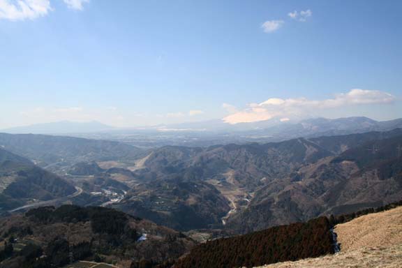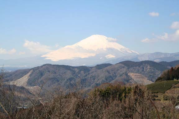 国道246号線を渡り、酒匂川に掛かる橋を渡り暫く舗装された道を登っていく.住宅の横から山道に入ると明るい日射しの注ぐ良く整備された山道が続いていた.途中二度ほど舗装道路を横切って登って行くと辺り一帯が牧草地状の丘の上に出た.頂上だと思っていたらそうではなく本当の頂上はもっと先にあるようだった.ここからの富士山方面の見晴らしは最高で富士の裾野から愛鷹連峰まで見渡すことができる.