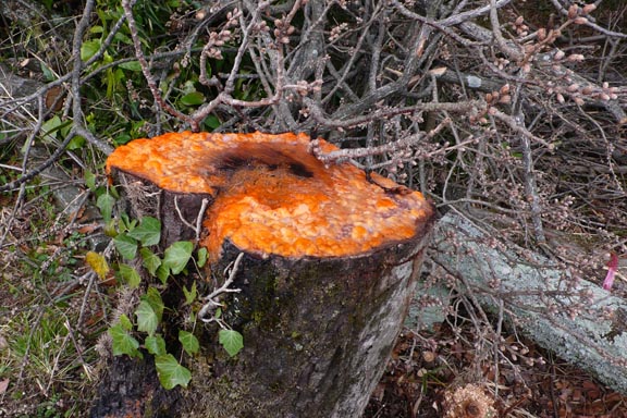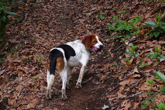 同じ道を戻ってもつまらないので、下道と呼ばれる山腹をぐるっと廻る山道を時計回りに戻ることにした.人気のない道だったのでいきなり目の前に犬が飛び出して来たときには野犬かと思いドキッとしたが、首輪に発信器とアンテナを付いていたので何かの狩猟犬かもしれない.愛想の良いおとなしい犬だったので、狩猟犬ではなく単に迷子防止の発信器なのかもしれない.