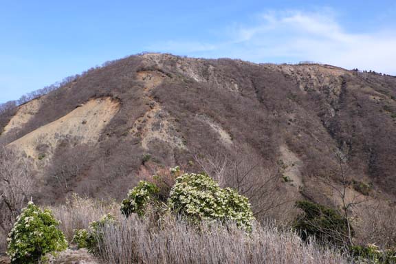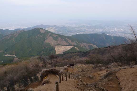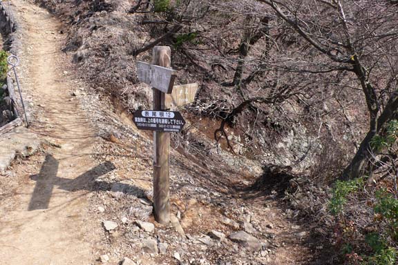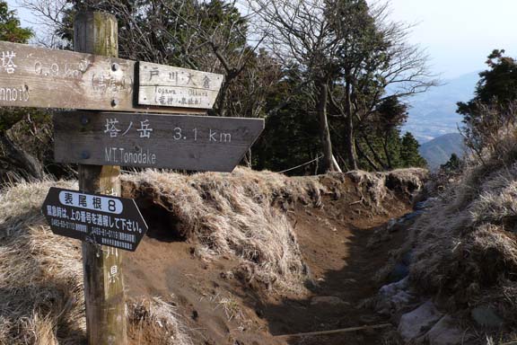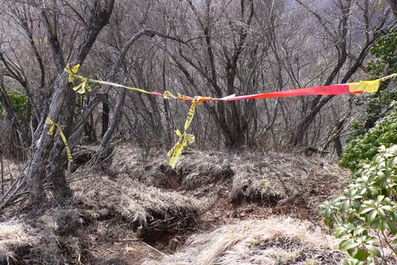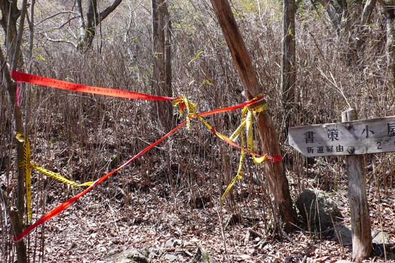 この日は春霞が薄く掛かっていたがそこそこの視界が得られそうだったので、好天に誘われて塔ノ岳へ登ってみることにした.これまで登ったことのない書策(かいさく)新道を登る予定だったが、先日の震災以降崖崩れや落石が激しく通行禁止措置が取られていた.大分以前から書策新道は崩落が激しく通行禁止の黄色いテープが貼られているようだったが、2011 3/20付けの日付の注意書きが書かれた真っ赤なテープが黄色のテープの上に重ねられていた.