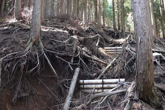 まだ余震が頻発している状況ではとても危険なので、仕方なくそのまま天神尾根を登り大倉尾根経由で塔ノ岳を目指すことにした.天神尾根の勾配はきつく杉や檜の人工植林で斜面崩壊が止まらず相当悲惨な状態だった.戦後の杉や檜の人工植林が如何に山を駄目にしたかが一目瞭然だった.人工植林された杉や檜で覆われた登山道を歩いていると本当に気が滅入る.