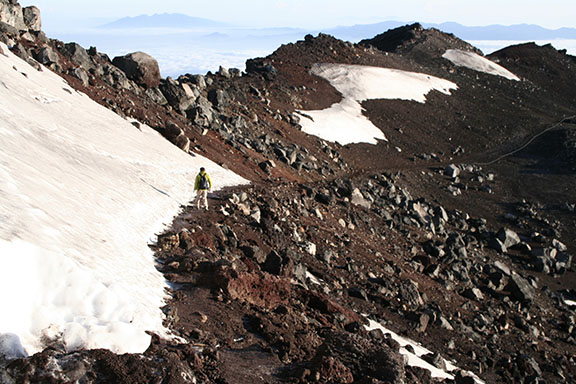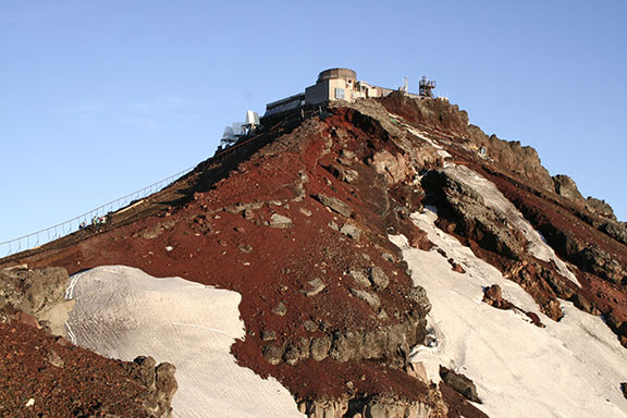 剣ヶ峰を後にまだ残雪の残る斜面を西安河原方面へ下りて行った.大沢崩れの上からは大きく抉られた斜面の様子が良く分かる.遠くから眺める富士山は綺麗な形をしているが間近で見ると結構いびつな形をしている.子内院と呼ばれる小さな火口跡に一旦下って白山岳の内側の斜面をトラバースして久須志岳へ登り返すと右手側に金明水と呼ばれる井戸がある.金明水から少し離れた登山道の脇に大きな貯水タンクが置かれていて小型の発動機につながれたポンプで水を汲み上げているようなので、金明水の付近では今でも水が湧き出しているのだろう.