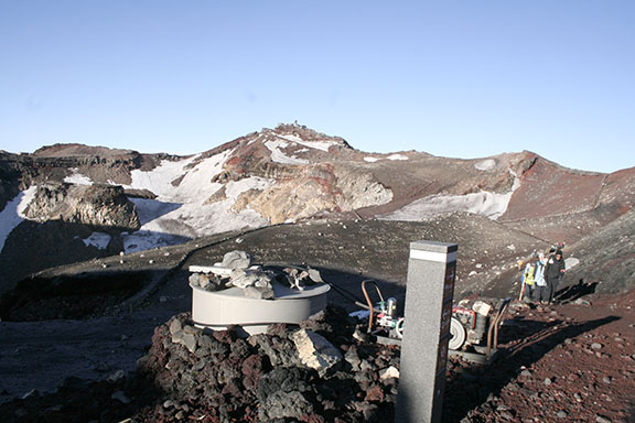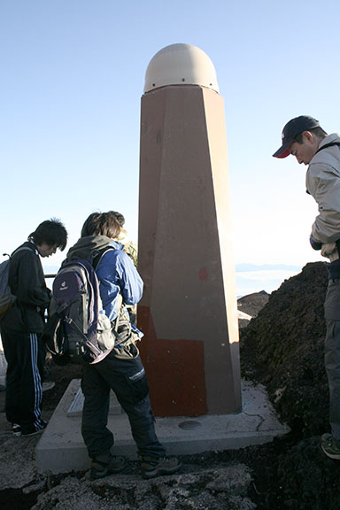 剣ヶ峰ではもの凄い写真待ちの行列ができるが、この日は行列もなくいつでも自由に記念撮影が行えた.皆が記念写真を撮る日本最高峰の記念碑の手前に二等三角点が設置されている.日本一の富士山が一等三角点ではなく二等三角点だというのは面白い.二等三角点の奥には電子基準点も設置されていたが、こちらは富士山の厳しい気象条件に耐えられるように作成された特別仕様の電子基準点だった.