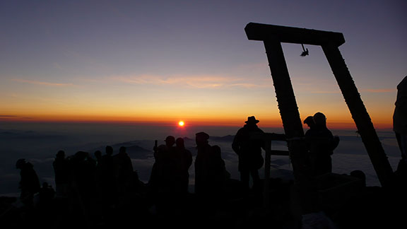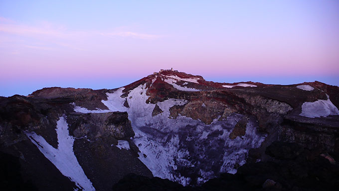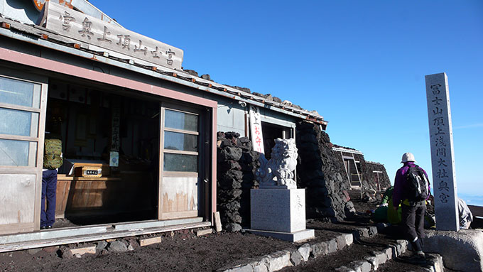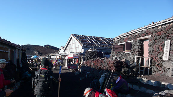頂上の山小屋は午前4時頃から営業を始めていた.富士宮口の公衆トイレも午前4時から使用できるようになる.トイレを管理しているおじさんに混雑期の状況を聞いてみたところ、御来光の後くらいから続々と人が押し寄せ、午前8時くらいまで延々と待ち行列ができると言っていた.週末やお盆の混雑期には御来光の前に先にトイレを済ませておけばその後の地獄のようなトイレ待ちの行列に並ばなくても済みそうだ.