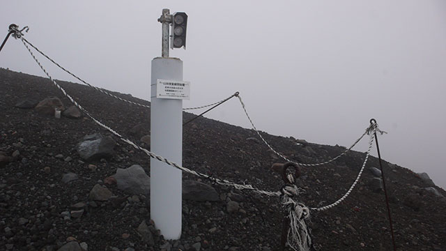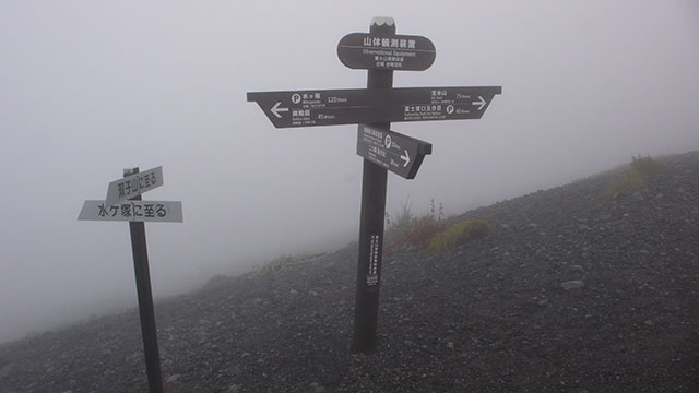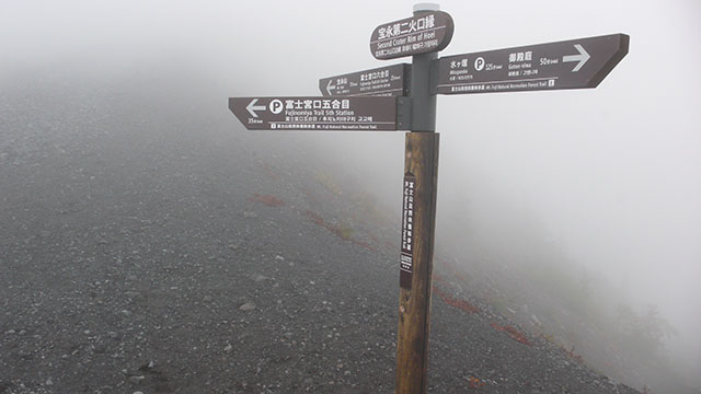 バスの時間は午後六時発だったので、時間潰しに宝永山まで行ってみることにした.ガスで全く視界が効かない状態での砂走りのような細かな砂礫の斜面を登るのは距離感が全くつかめず想像以上に疲れた.標高2,700m付近では気温が低く、霧雨のような濃いガスが霜となって袖口が白くなっていた.とりあえず馬の背を経由して宝永山の頂上までは行ってみたものの、何も見えないのでそのまま五合目まで引き返した.