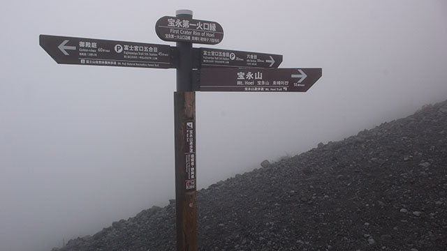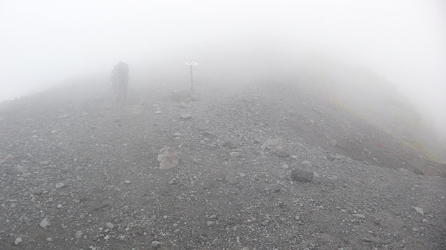 宝永第二火口縁まではザレた急斜面を延々と直登しなければならず、視界不良で何も見えない状態で登り続けるのはかなりきつかった.第一火口縁まで来ると富士宮口五合目からやってきた観光客が目に付くようになった.ガスって居なければ目の前に雄大な宝永火口が見ることができるのだが、視界はせいぜい10m程しかなく観光客も諦めて引き返していた.