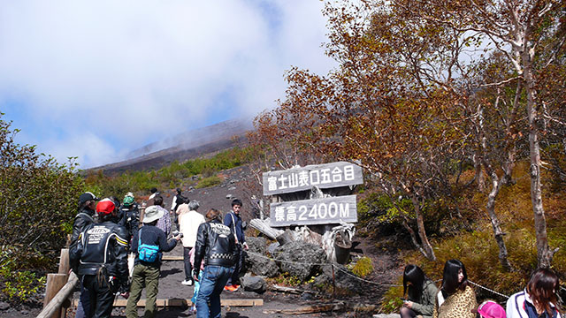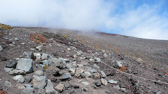 早朝東海道線や身延線の車中からは雲のない富士山が見えていたので今日は絶好の天気になりそうだと思ったが、富士宮口の5合目に着く頃には下界はすっかり雲に覆われてしまっていた.須山口下山歩道のある1合目〜3合目付近は完全に雲の中だったので、下山する頃までに晴れてくれることを祈って観光客で賑わう5合目登山口から登っていった.