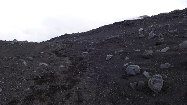 大砂走りを駆け下りたのは良かったが、もの凄い濃霧で2〜3m先も殆ど見えない状態だった.体中凝結した水滴だらけで下に下りるまでに防止やザックがすっかり濡れてしまった.肝心の二合八勺の気象庁避難小屋もどこにあるのかも全く検討がつかなかったので、GPSロガー(ASG-1)の標高表示だけを頼りに大砂走りを下りて行った.