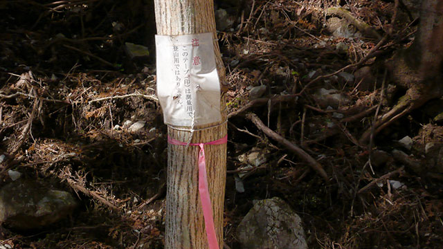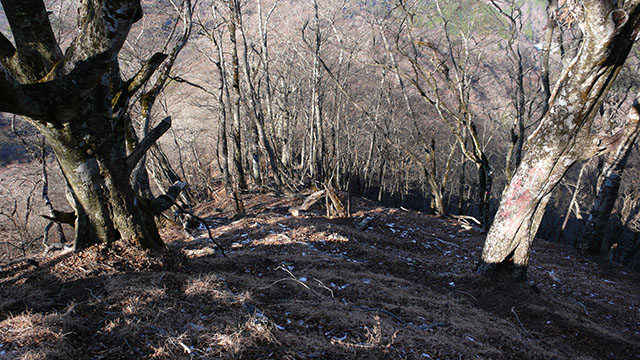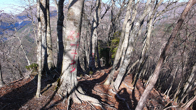 こちらのルートは鍋割山からユーシン方面へ抜ける最短ルートではあるが、国土地理院の地図にはルートが載っていまるが『山と高原』地図には載っていない.一般の登山道のようなはっきりとした踏跡はないが、赤いペンキの矢印に従い尾根伝いに下って(登って)行けば比較的簡単に歩く事ができる.