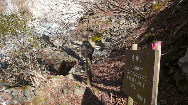 この沢ノ中を歩くコースは昼間の見通しが良い場合はそれほど困難な事はないが、雨やガス、日没など条件が悪い場合は決して立ち入らない方が良いだろう.何度も河原を徒渉しなくてはならず、標識も心許なくピンクのマーキングテープだけが頼りの箇所が殆どである.表尾根や大倉尾根、鍋割山稜などのメジャーな易しい登山道しか歩いたことのないレベルの人達がこのコースに足を踏み入れるのはお薦めできない.