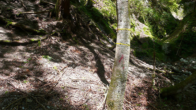 ユーシンロッジの裏の沢には確かにマーキングがされているが...
