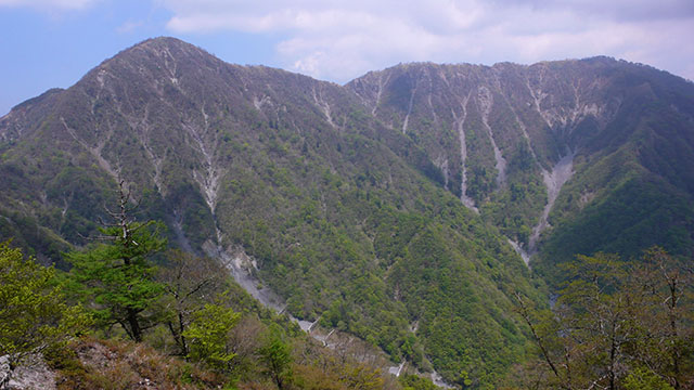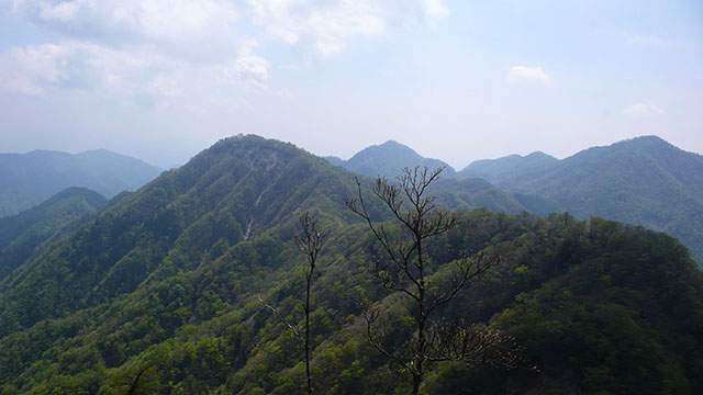 左から臼ヶ岳、同角ノ頭、石棚山稜そして檜洞丸