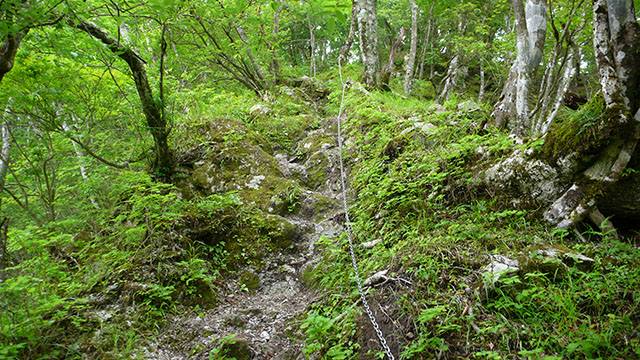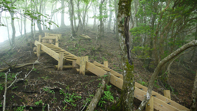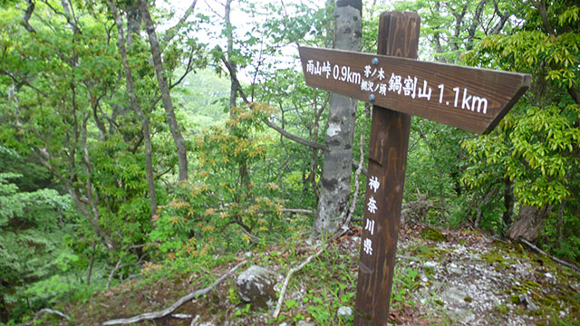 雨山峠から鍋割山までのルートは3個所の長い鎖場が有る以外はとても整備されていて歩き易い道だった.この鎖場は初心者にはちょっと難しそうだが中級以上であれば何ら問題無いだろう.鍋割峠から鍋割山までのルートはつい最近整備されたようで真新しい木の階段が接地されていた.鍋割山から熊木沢出合へ抜けるオガラ沢ルートの入口に立てられていた注意看板は引き抜かれていたので、神奈川県はこのルートを完全に抹殺したいのだろう.