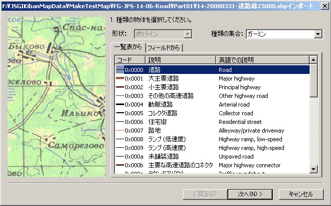Shapeファイルを読み込むとガーミンGPS上で表示する道路の線の種類を尋ねられるので、適当な線種を割り当てる.本来であれば道路の種類に応じて線種を使い分けるのだが、基盤地図情報から変換されたShapeファイルには1種類の線しか記述されていないようだ.