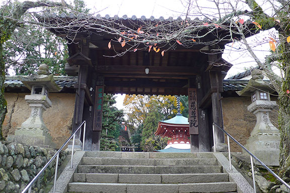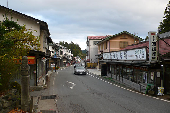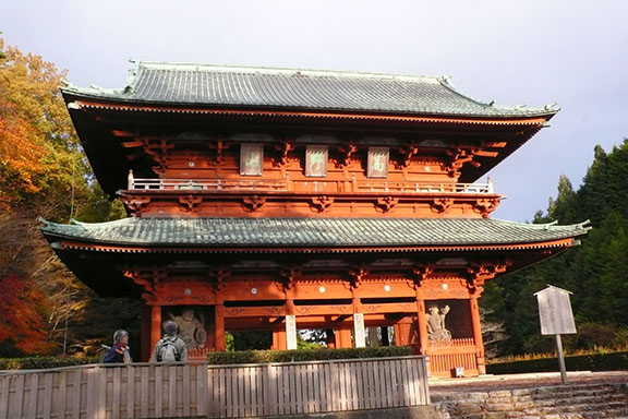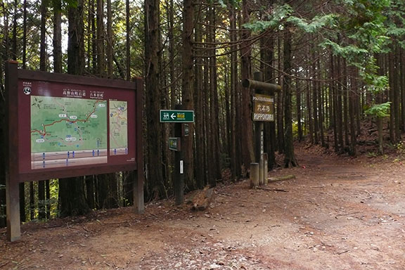 袈裟掛石、押上石を過ぎ車道を横切ると大きな四阿のある展望台に出る.四阿から降りて行くと直ぐに車道に出るが、車道の向こうにある町石に向かって車道を横切ってしまいそうになるが、ここでは車道を渡らずにそのまま車道の手前を右下に折れる.今まで遠くに鳴り響いていた車のエンジン音が段々間近に聞こえてくるようになってきた.最後の急坂を登るとようやく大門に辿り着いた.