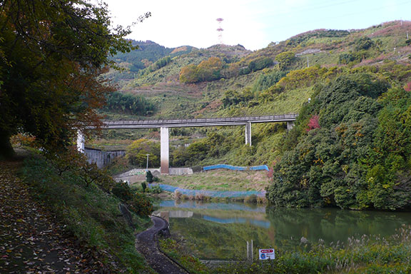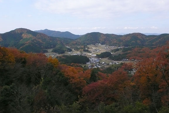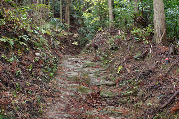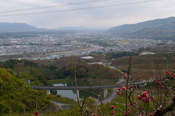 最初はこの地方の名産品である富有柿の畑の中のコースが続く.真っ赤に熟した柿の実を横目にひたすらコンクリート舗装された固い農作業道を登って行く.六本杉という場所で天野の里へ分岐する道とに別れるが、真っ直ぐ行くと天野の里へ下りてしまうので町石道をそのまま行くにはUターンするように左に折れる.ここから二ッ鳥居まではほぼ平坦な道が続く.二ッ鳥居の手前には展望台があり、眼下に天野の里が広がっている.