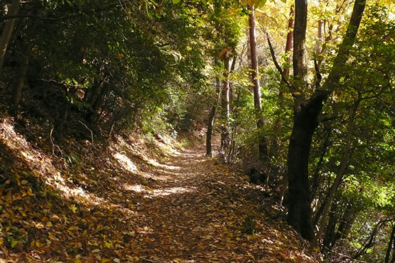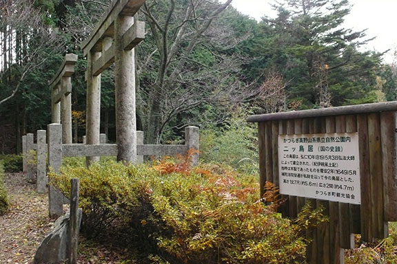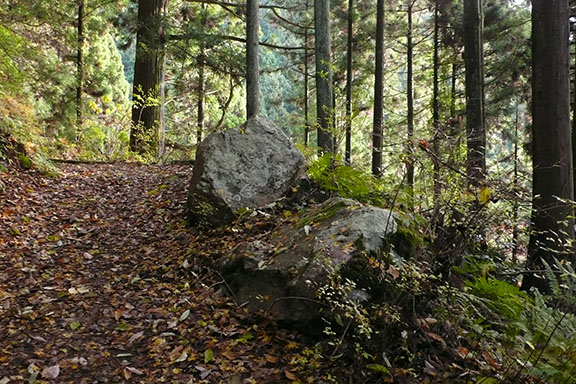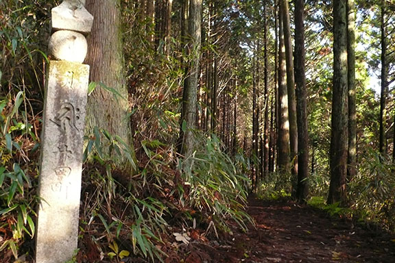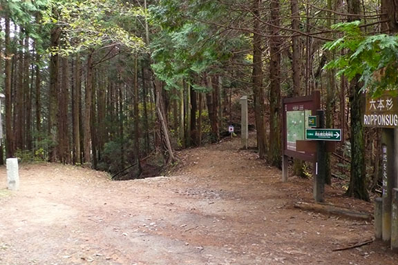 二ッ鳥居からは一旦下った後緩やかなアップダウンを繰り返す.ゴルフ場の横を通り抜けると地蔵堂と呼ばれる小さなお堂のある場所に出た.直ぐ側に公衆トイレがあり休憩するには丁度良い所だ.木漏れ日の美しい雑木林の道がとても心地良い.矢立という所まで暫く緩やかな下りが続く.矢立で車道を横切るとここからは急な上りとなる.高度を上げるにつれ杉の巨木が目立つようになる.