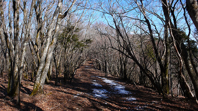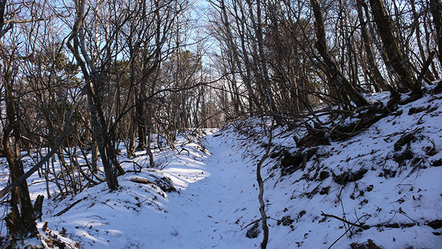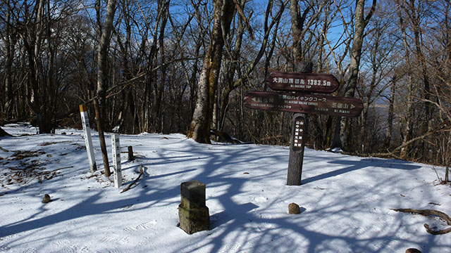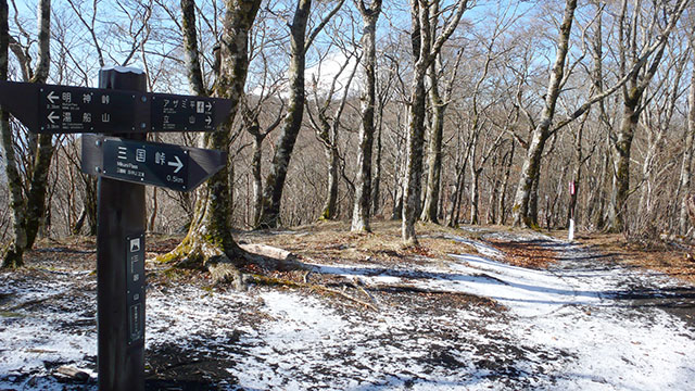 籠坂峠から大洞山(角取山)を経て三国山へ向かい、そこから三国峠、鉄砲木ノ頭(明神山)、切通峠、高指山と国境尾根の稜線沿いにのんびり富士山を見ながら散歩することにした.この日は第一級の寒気団の影響で標高1000m以上の山々はうっすらと雪化粧していた.一月前の富士箱根トレイルでは須走から登ったが、今回は篭坂峠までバスを使い楽をすることにした.うっすらと雪の積もった歩き易い山道は静かでとても心地良く、紅葉の季節とはまたひと味違った風情を楽しめる.