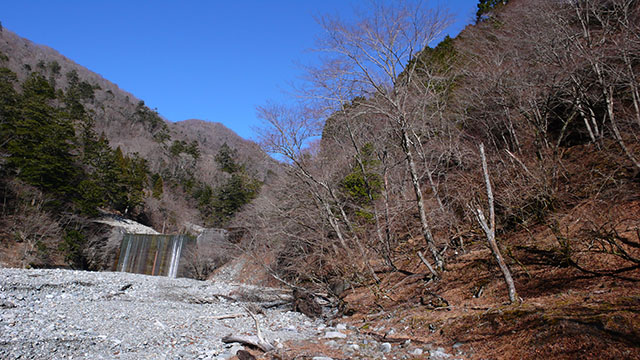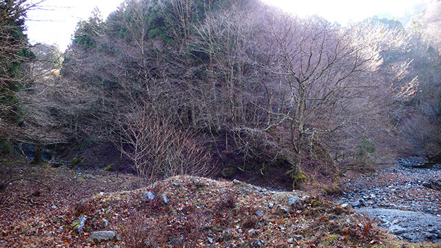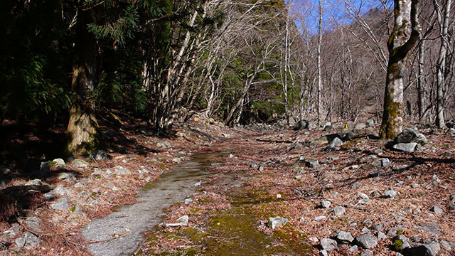 途中から右岸のかつての堰堤工事用道路の残骸を歩く