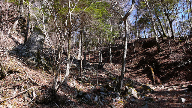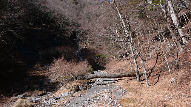 大きな石ころだらけの歩きにくい河原から堰堤工事のため作られた道路の残骸を登って行く.当然ながら廻りには誰も居ない.バリエーションルート愛好家のホームページで見た赤いミニバンの軽自動車が置かれている場所の先から南斜面へ取り付くが、ガレた急斜面で油断すると下まで石ころと一緒に落ちてしまいそうだ.途中でマーキングテープを見失いかなり足場の悪い斜面を何とかよじ登り何とか尾根筋へ辿り着いた.
