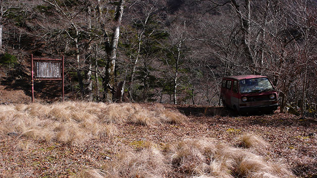 西沢の最初の堰堤の前にある赤いミニバン