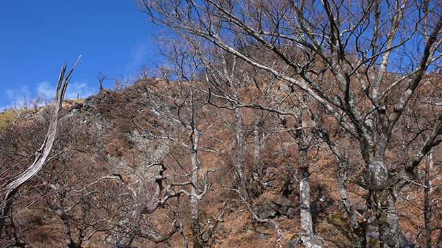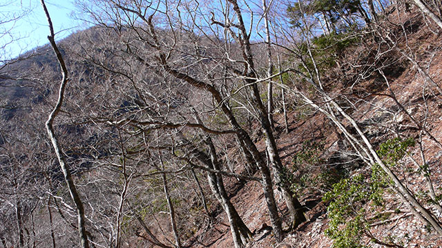 いつもなら寄から雨山峠経由で入るところだが、後沢の右岸尾根ルートを歩いた事がなかったのでちょっと鍋割山へ寄り道してオガラ沢から熊木沢を経て、蛭ヶ岳南斜面に取り付くことにした.熊木沢から見る蛭ヶ岳南斜面はあまりにも急な斜面でどう見ても絶壁としか思えない.果たしてあんな急斜面を本当に登る事ができるのか不安になる.