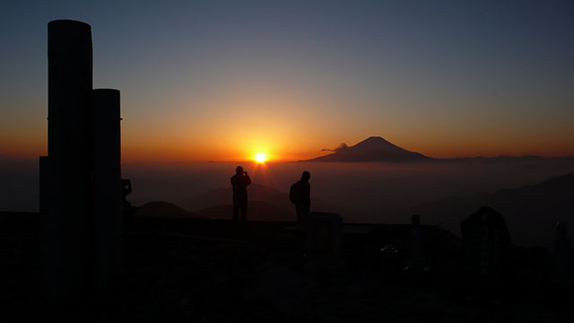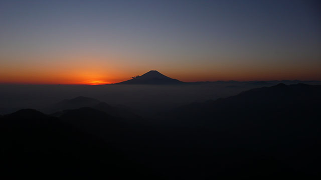 塔ノ岳の頂上では毎週のように夕日に沈む富士山を眺めに来ている中年のおじさんがいて、iPadで撮影した夕日に沈む富士山の写真を見せてくれた.塔ノ岳からのダイアモンド富士は10月中だったらしく、この日は富士山の大部手前の水平線に日が沈んで行った.