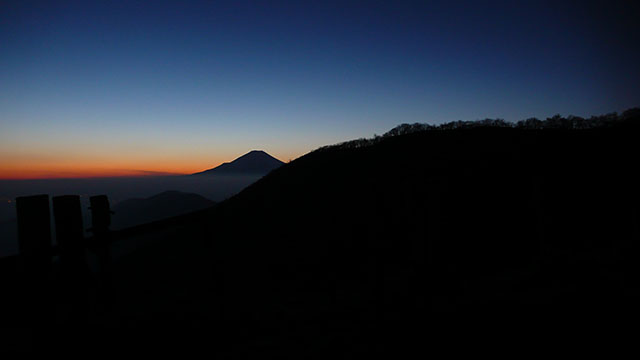 富士山のシルエットを見ながら山を下りる