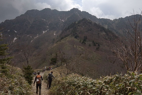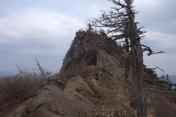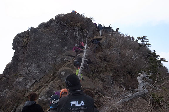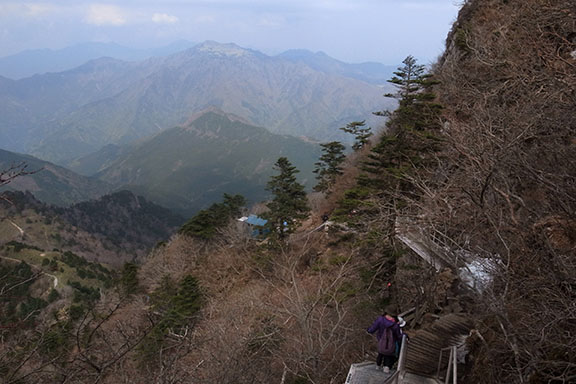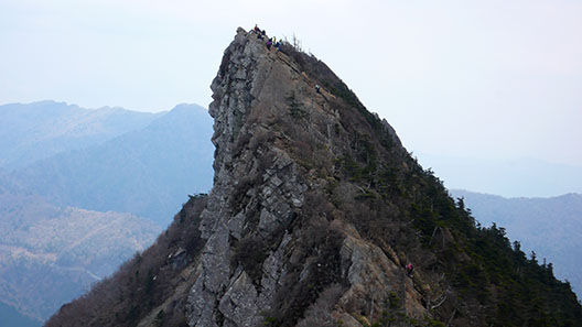 この表参道コースは冬場を除けば、初心者や家族連れでも登り易いハイキングコースで面白味は無いが、鎖場の上り下りはちょっとしたアトラクションだろう.石鎚山の鎖はちょっと特殊で、鎖と言うよりは鉄アレイを繋げたような物と言った方が良い.皆鎖のつなぎ目の輪に足を掛けようとするが、大人の登山靴ではつま先をこの輪の中に入れることは難しい.地下足袋であれば容易に入りそうなので、この特殊な鎖は修験者用に作られているのだろう.