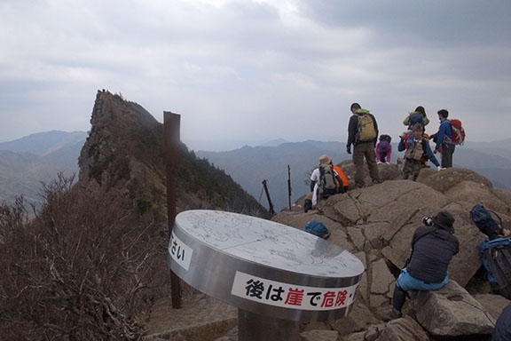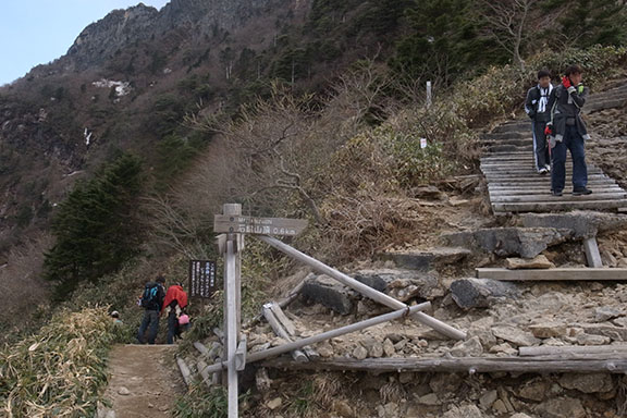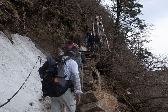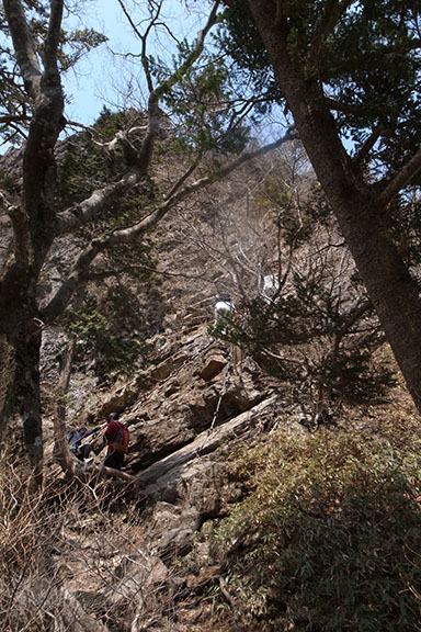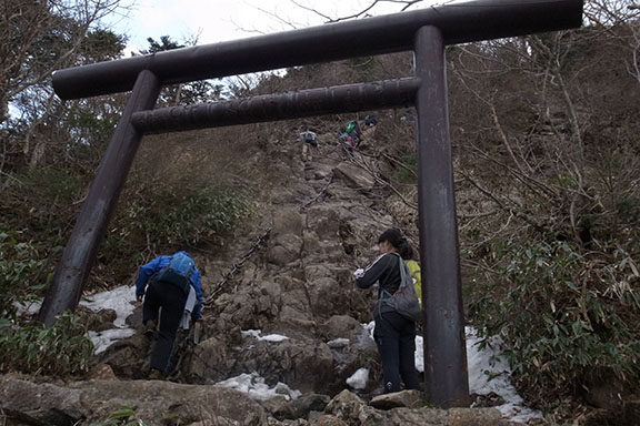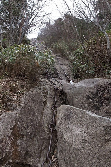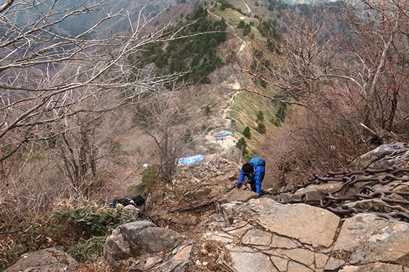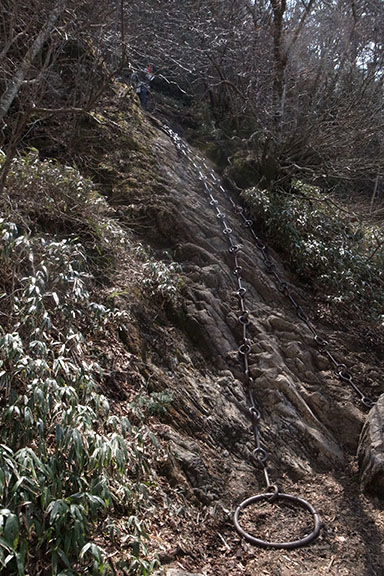 登山慣れしていれば鎖に体重を掛けることなく、岩の窪みと鎖とを上手く使ってスムースに登って行くことができるのだが、初心者は皆鎖だけに頼って登ろうとするのでなかなか先へ進めない.初心者が自分の力量をわきまえないで果敢に鎖場に挑戦してみたものの、途中で身動きがとれなくなって半べそで鎖にしがみついて誰かに助けを求めるなどという事態にならないように、事前にちゃんと鎖場の練習をしておきましょうね!
