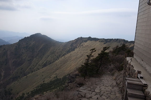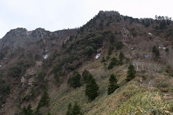 成就社の遙拝殿からは直接石鎚山が見渡せるようになっており、石鎚山そのものが御神体として崇められているようだ.今回の山行の安全を祈願し登山口の門を潜り石鎚山の頂上へ向かった.