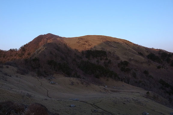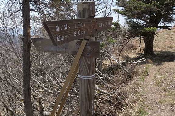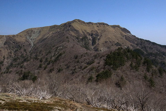 日の出の撮影を終え、避難小屋に戻りゆっくりと朝食を取った後、午前8時前に避難小屋を後にして今日の目的地である剣山へ向かった.お亀岩から西熊山までは緩やかな登りで、ほんの10数分で頂上に着いた.ここからはお亀岩避難小屋や地蔵ノ頭、天狗塚方面が綺麗に見渡せる.東の方向へはこれから向かう三嶺へのなだらかな稜線が続いている.