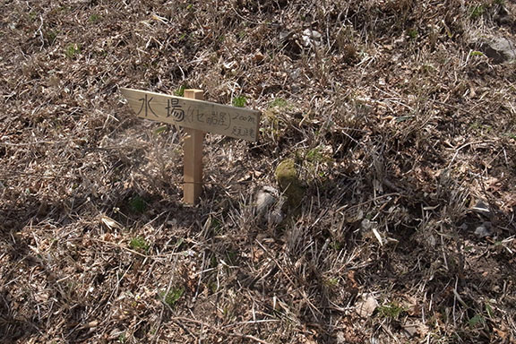 高ノ瀬の先で伊勢の岩屋の水場の標識を発見するが、足場が悪く危険なため探索を断念