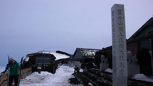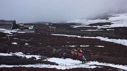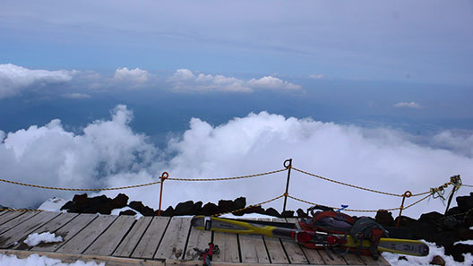 8合目から上は吉田口から登ってきたスキー目的の人達で一気に賑やかになった.登山道の大部分はまだ雪で覆われており、腐れ雪に足を取られて意外に苦労した.剣が峰に寄ることを考えて居たが、腐れ雪の上を歩くのは大変そうなので今回はお鉢廻りは行わないことにした.頂上で30分程休憩してから下山を開始するが、そのまま歩いて下りるのはつまらないので、持ってきたハイキング用のビニールシートをお尻の下に轢いて尻セードで斜面を一気に下った.子供の頃は良く雪の斜面でソリ遊びをしていたが、この年になって自分のお尻でソリ遊びをするとは思いも寄らなかった.童心に返ったようでとても楽しいソリ遊びだった.