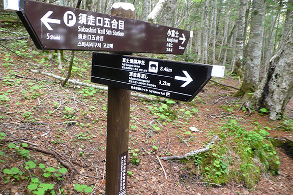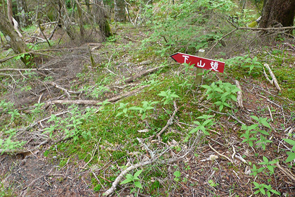 須走口は大陽館の下から登山道と下山道に分かれるが、登山客は誰も居ないので下山道ではなく登山道で5合目の小御嶽神社まで下り、そこから富士箱根トレイルコースに指定された旧登山道を使って馬返しまで下りた.富士箱根トレイルの標識が新しく設けられていたので登山道としてきちんと整備されているものだと思っていたら、コース自体はまだ何も整備されておらず、以前と同じように倒木だらけでピンクのマーキングテープが所々にあるだけの准バリエーションルートだった.まだ一般のハイカーが歩けるようなハイキングコースにはなっていないので初心者は近づかない方が良いだろう.