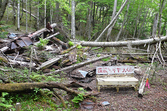 廃墟小屋の残骸に置かれたベンチが何故か物悲しい